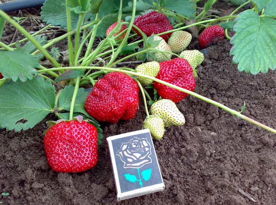 Усеченно-конические ярко-красные ягоды очень крупные (35-75 г). Мякоть при окончательном созревании очень сладкая. Отличная устойчивость к земляничному клещу и другим заболеваниям и вредителям.